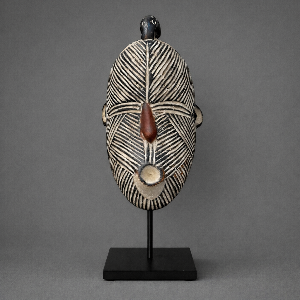 Hand-carved African wooden mask inspired by Kuba and Pende art. Features geometric linework, bird motif, and bold patina – a unique cultural statement piece.