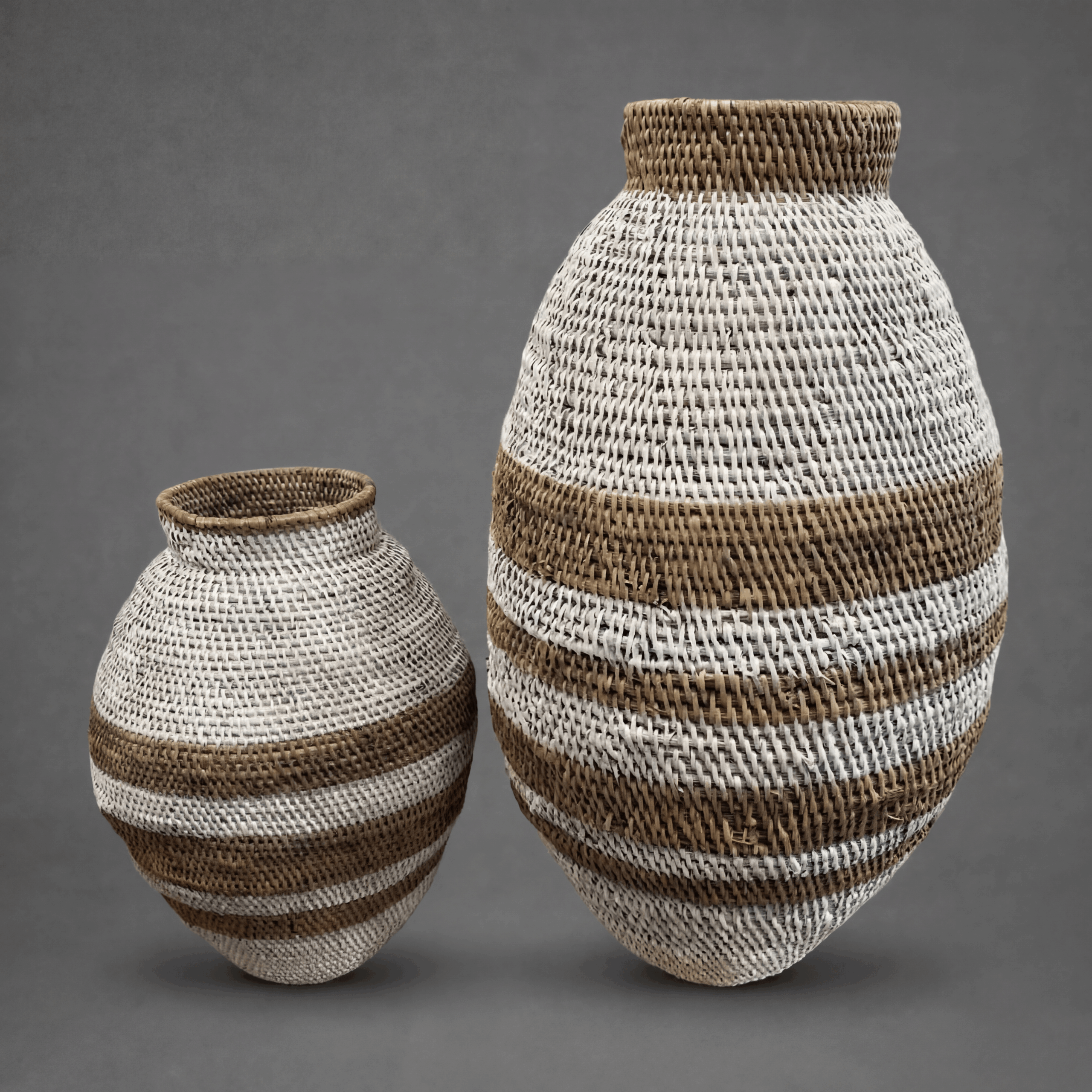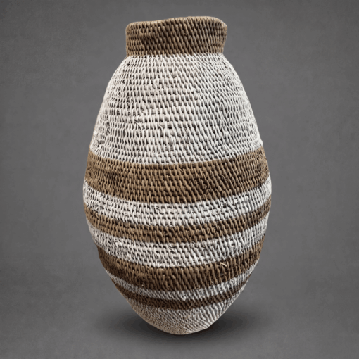 Entdecken Sie die handgeflochtenen Körbe aus dem Binga-Distrikt in Simbabwe. Jeder Korb wird liebevoll aus lokalen Palmblättern und wilden Zweigen gefertigt, um ein einzigartiges Flechtmuster zu präsentieren. Diese Kunstwerke eignen sich perfekt als stilvolle Tisch- oder Wandschmuck.