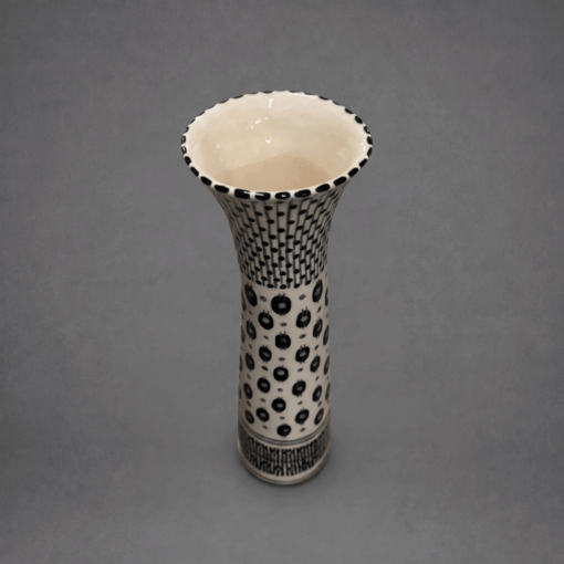 Diese hohe, zylindrische Vase verjüngt sich in der Mitte und weitet sich nach oben, wodurch sie eine schlanke, raffinierte Silhouette erhält.