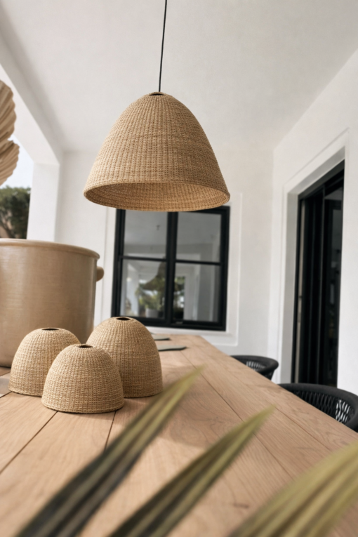 Das dicht gewebte Design verleiht dem Lampenschirm eine strukturierte und elegante Optik, während das Licht sanft und gleichmäßig gestreut wird, um eine gemütliche und einladende Stimmung zu schaffen. Ob als stilvolle Pendelleuchte, über dem Esstisch oder als dekoratives Highlight in einem boho-, küsten- oder rustikal inspirierten Interieur – dieser Lampenschirm bringt Authentizität und handwerkliche Exzellenz in Ihr Zuhause.