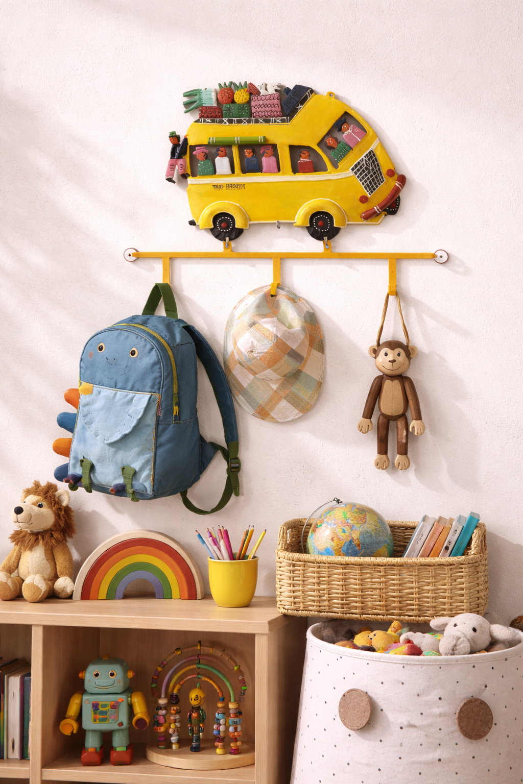 Unser handgefertigter Metallblech-Bus ist ein bezaubernder Wandhänger mit drei Haken, perfekt für das Kinderzimmer. Jedes Stück unterstützt afrikanische Kunsthandwerkstraditionen und die lokale Gemeinschaft. Verschönern Sie das Zimmer mit diesem einzigartigen, praktischen und künstlerischen Accessoire.