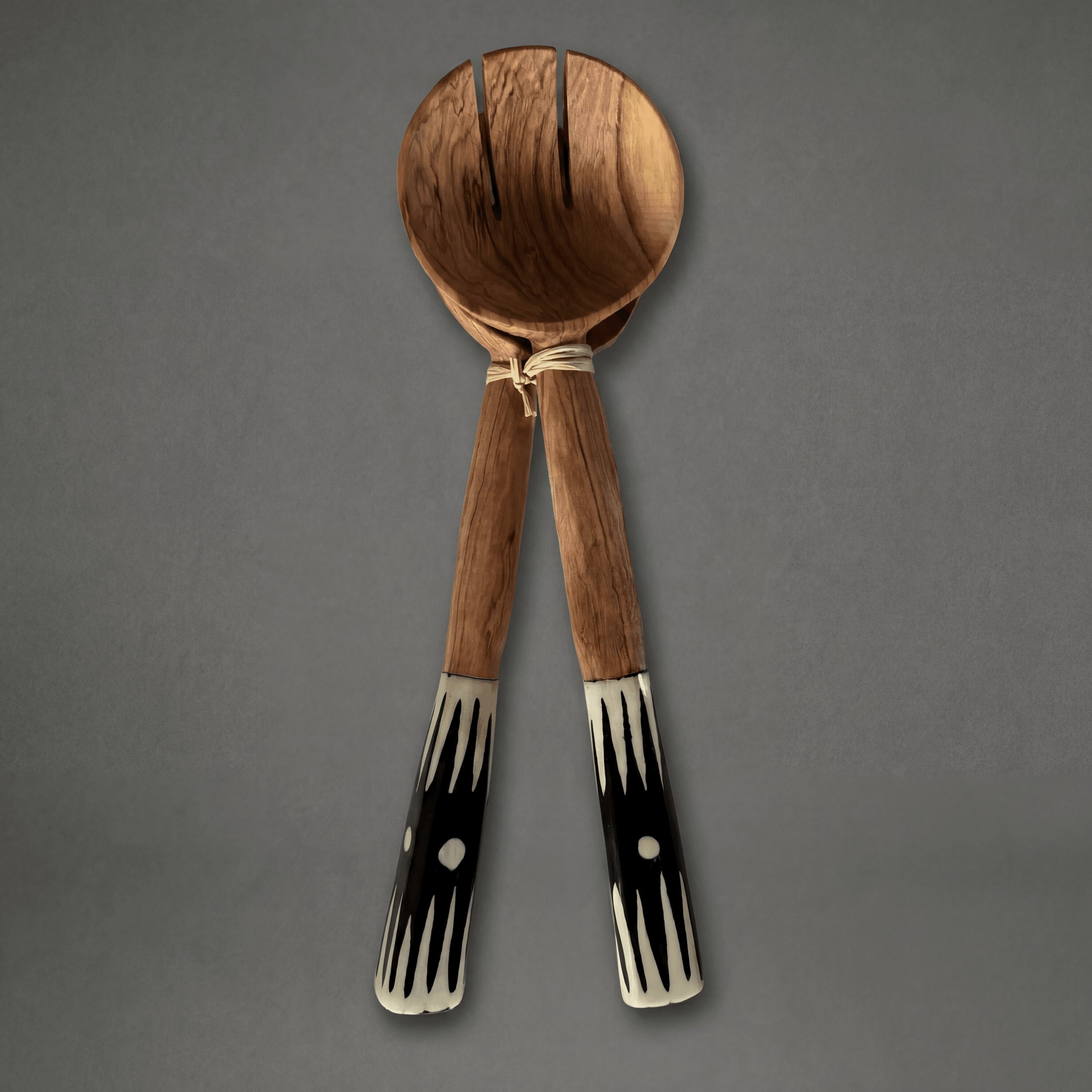 Stilvolles Salatbesteck aus Olivenholz mit modernen Zickzack-Batikgriffen – ein echter Hingucker!