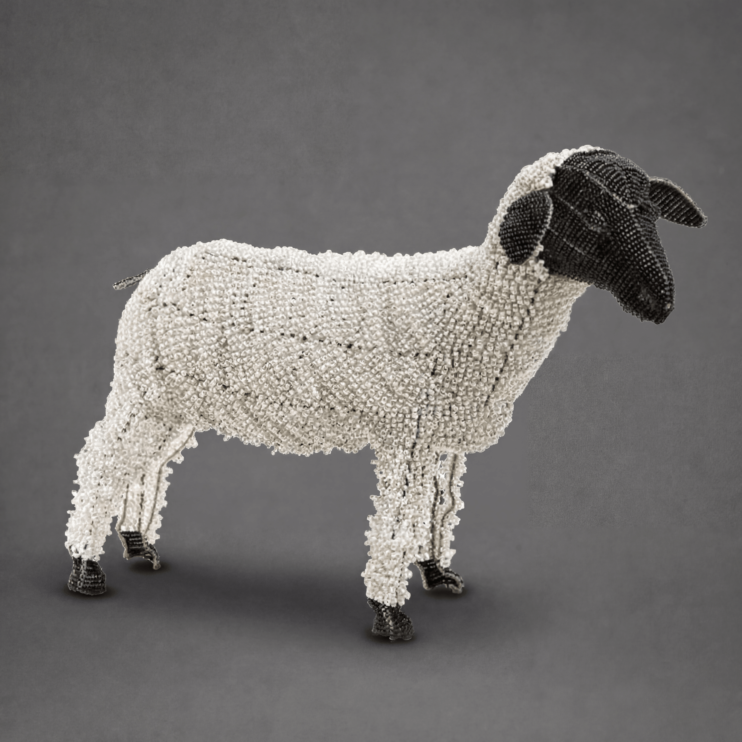 Unser handgefertigtes, mittelgroßes Schaf, kunstvoll mit Perlen verziert, entsteht durch das Geschick afrikanischer Künstler. Jedes Detail trägt zur Individualität bei und stützt lokale Kunsthandwerkstraditionen. Ihre Unterstützung beim Kauf bewahrt das künstlerische Erbe und unterstreicht die Bedeutung von Handwerkskunst und Solidarität in der afrikanischen Kunstszene.